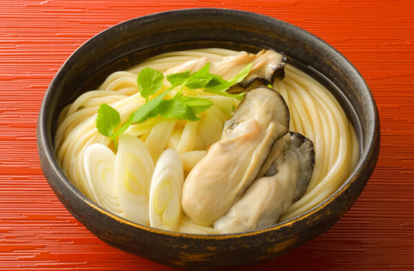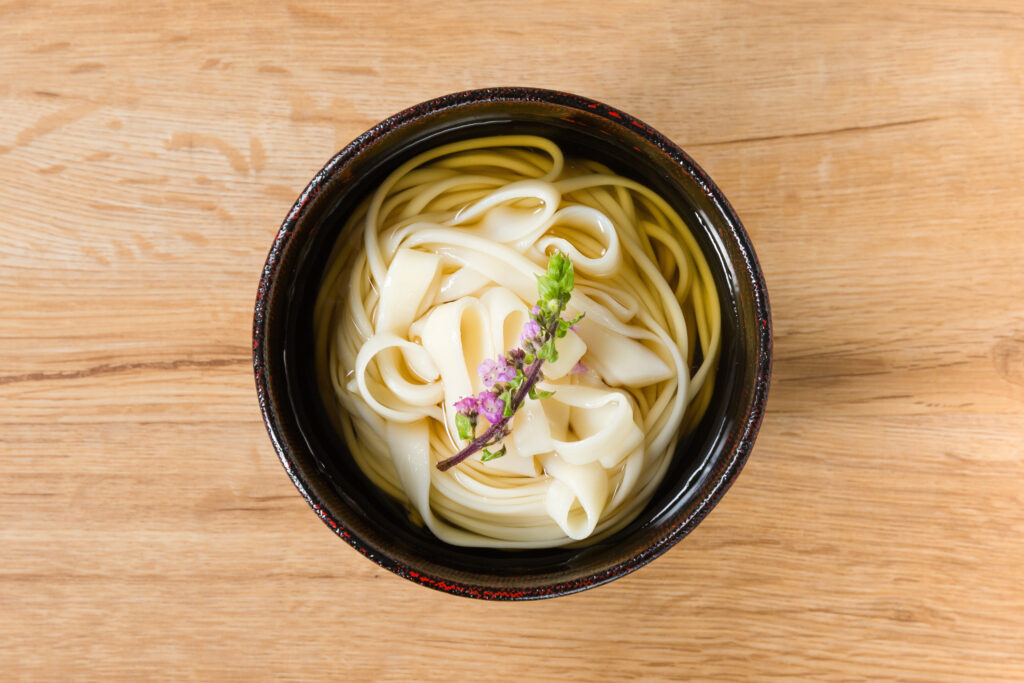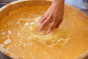 温かくして召し上がる時は、氷水でしめた後に、熱湯をくぐらせてから、温かいつゆに入れる事が大切。