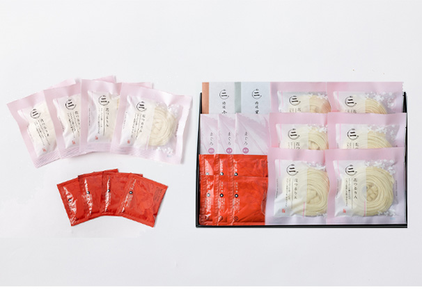 コシ、手延べ特有のつるんとした食感、麦の香りもさることながら、天然コラーゲンを加え、見た目はお花のように可愛らしく、茹で上げれば透明感のある美しく美味しい麺に仕上がりました。