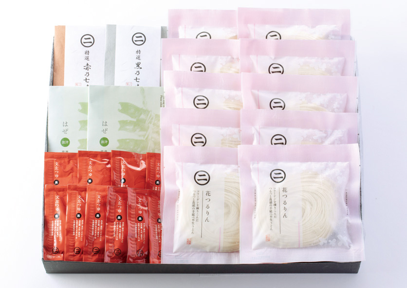 花つるりん10食・うどんつゆ10個・はぜ出汁5個・赤乃七味1個・黒乃七味1個