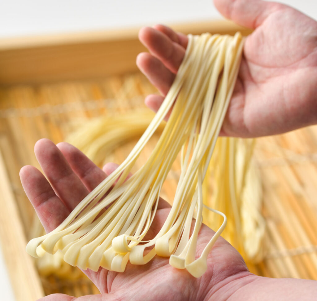 「より」「のばし」「ねかし」を幾度も繰り返し、20を超える工程を経て手引きされた麺は、栗駒山から吹きおろす風を受けて絹糸の様に白く美しく舞いはじめます。